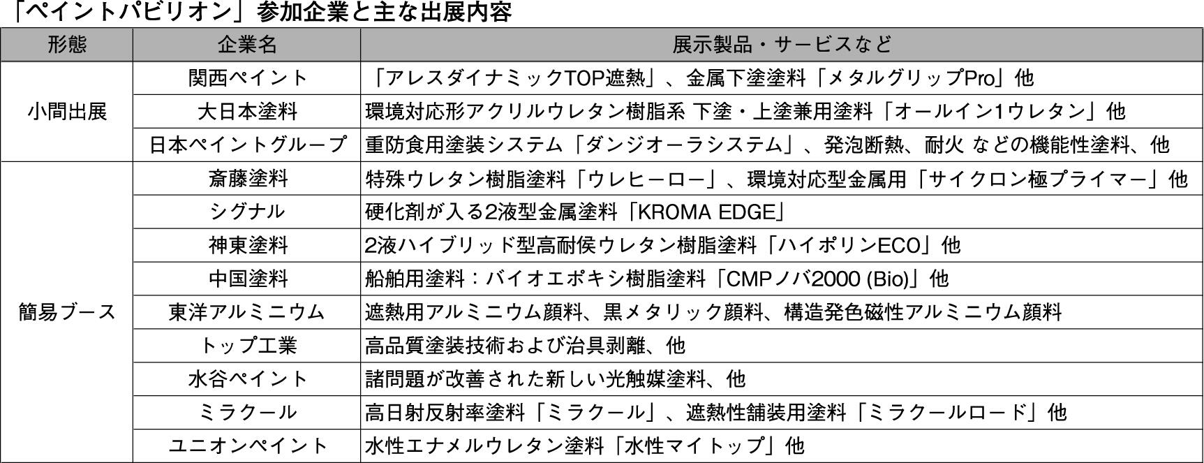 今回、日塗工の「ペイントパビリオン」には12社が参画し、昨年の9社から3社増えた(別表参照)。ペイントパビリオンの企画・運営に尽力した日塗工普及広報部長の清水慶司氏は「多くの来場者に来ていただいたのはもちろん、長時間にわたり説明員とコミュニケーションを取る様子が見られました。概ね理想的な成果が得られたと考えています」と手応えを口にする。