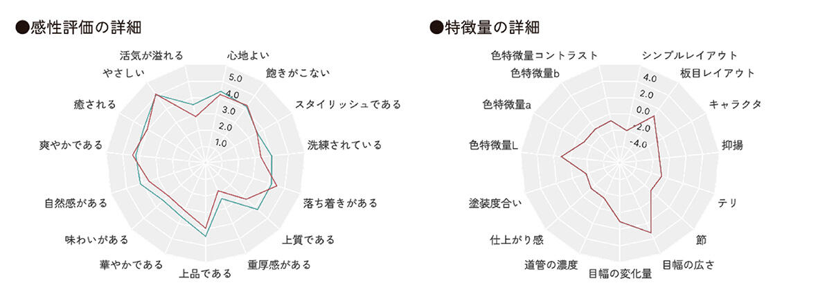 また、より詳細に感性評価を判別するため、15項目による感性評価に落とし込むことが可能。合わせて16項目による木目特徴量の定量化も可能にしており、デザイン開発の指標として活用できるようにした。