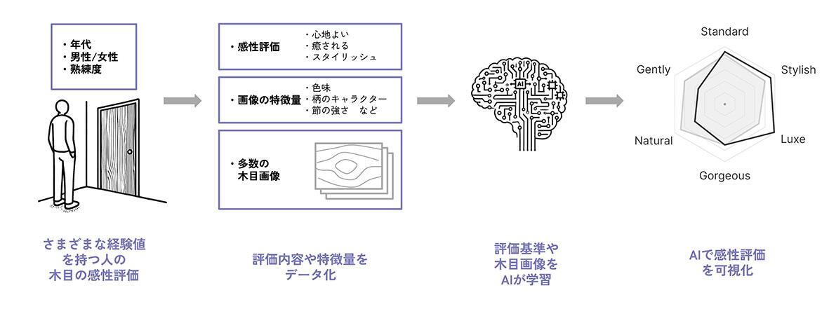 こうした開発及び製品化における感覚的な要素を見える化したのが「MOKUMETRIX(R)」。木目柄が人に与える印象など複雑な感性評価を定量化し、傾向を詳細に分類できるようにしたのが特徴。長年の事業で蓄積したデザインなど3万件を超えるデータを取り込み、AIを使って瞬時に判定できるようにした。