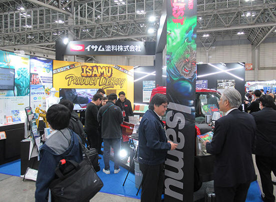 単独ブース出展のイサム塗料は、2液型ウレタン塗料「ポセイドン5000」や1液型アクリル樹脂塗料「アクアシャインGA」といった工業用水性塗料などの環境対応製品、自動車向け、タイル床面向けの塗料など多角的な提案を揃えた。