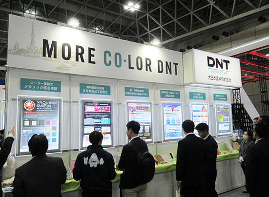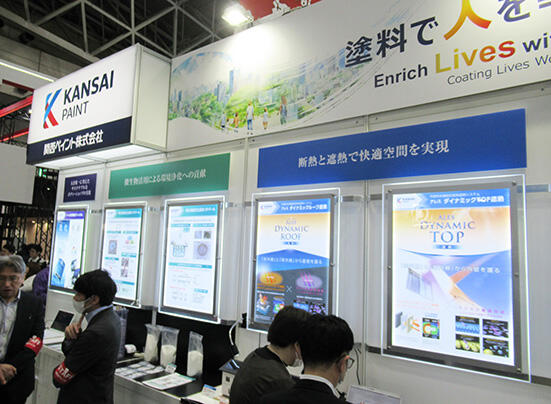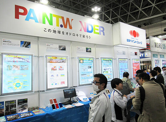 大日本塗料のブースでは、塗装現場の省工程・省エネルギー化につながる塗料など、持続可能な社会の実現に貢献する高機能塗料を紹介した。
