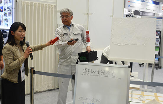 塗装の実演は、会期初日は関西ペイント、2、3日目は日塗装が担当し、1日に4回以上実施した。関西ペイントは断熱塗料のコテ塗り、日塗装は木目模様とフェイクモルタルの塗装を披露した。