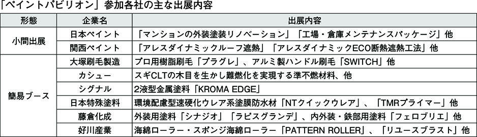 今回の「PAINT PAVILION(ペイントパビリオン)」は、日本塗料工業会(日塗工)、日本塗料商業組合(日塗商)、日本塗装工業会(日塗装)の製販装3団体及び塗料メーカー6社、刷毛・ローラーメーカー2社の計8社が参加した(別表参照)。
