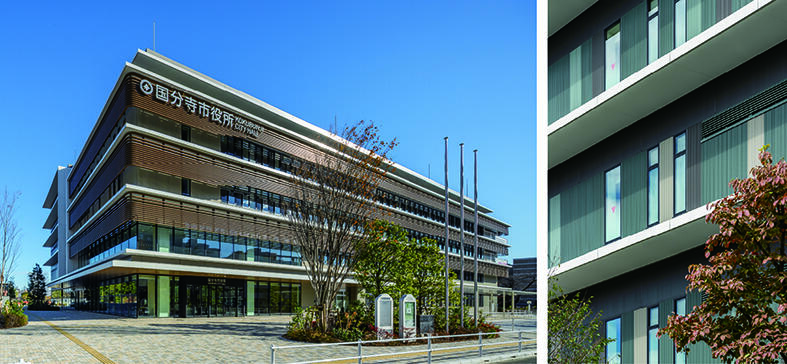 新築部門の最優秀賞は「国分寺市役所 新庁舎」。周辺環境との調和を意識し、建物の長手立面が面する道路側と公園側とで異なる外壁の基調色を採用している。表彰式で田嶋豊審査委員長は「公園側に選定された低彩度のグレイニッシュグリーンの公園の緑との調和が素晴らしい」と絶賛した。