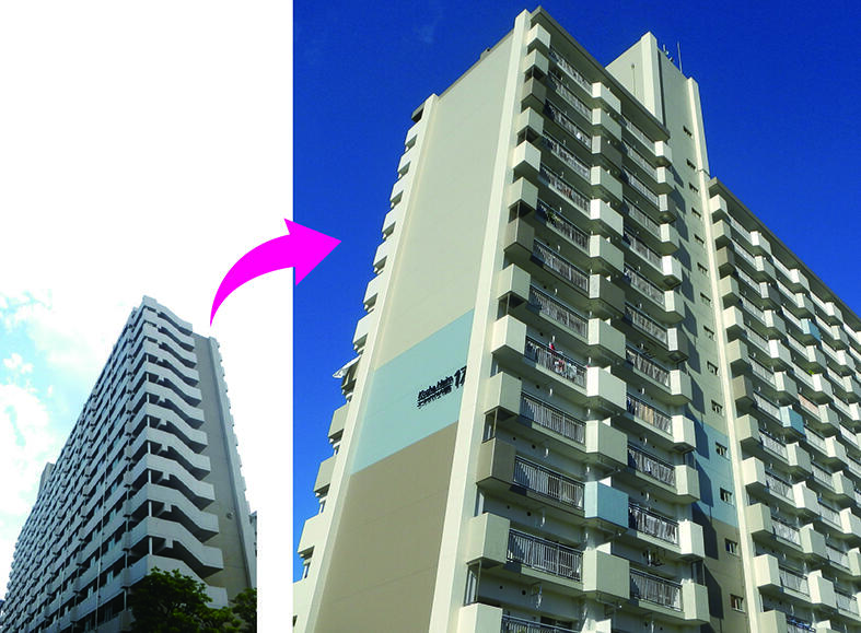 「コーシャハイム八潮北、コーシャハイム八潮西、コーシャハイム八潮南」は、複数事業者が建設した大規模団地内に点在する公社住宅を対象とする改修提案。妻側及び平側の中層部における配色について、分割しつつ連続性を持たせることで景観にリズムを生み出していることが高評価につながった。