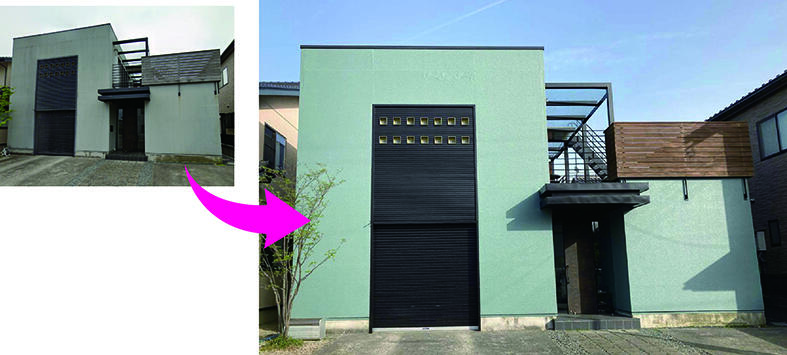 「N様邸(富山県)」は、講評で「中明度・低彩度のグリーン系外壁色の選定が秀逸。板金部分の黒やバルコニー木部の塗装色との面積比により、建物全体のバランスが一層整った印象を与えている」と評された。