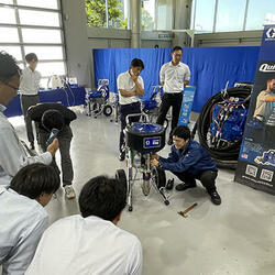 説明会後はラボに移動し、各機種の実演塗装を実施。ポンプ交換の手順やトラブル時の対応など、現場を想定した質問が多く寄せられた。