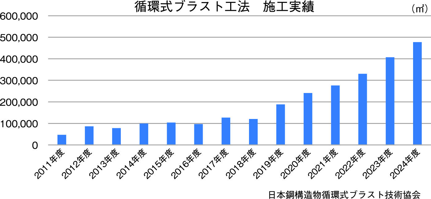 橋梁をはじめ鋼構造物の塗り替え工事の素地調整で行うブラスト施工において、金属系研削材を用いて循環・再利用する工法が全国的に広まっている。研削材を廃棄せず再利用することで、産業廃棄物の発生を大幅に抑えることができ環境負荷低減の観点から、国や自治体、高速道路会社などで採用が広がっている。