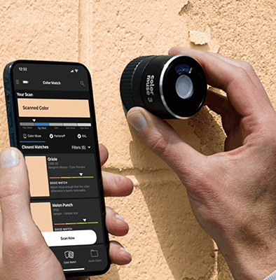 同品は、現物の色を測色するデバイス(本体)と、色情報をスマートフォン上で表示する無料のアプリからなり(写真②)、測色したいものの表面に本体をあてるとスマートフォンの画面に色情報が表示される(写真③)。現物の色に合わせて塗料を手配したい場合などに重宝する。