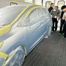 その後、研修センターに場所を移し、新製品の「PPエコブレンダー」「レンズリフォーマー3」「ハイアートCBエコ 水性防錆コート」「ノンスチレンスプレーパテ」(開発品)、「ビーストブースト剤」の自補修用5製品と工業用水性2液ウレタン塗料「ポセイドン5000」を紹介。加えて昨年発売した「CRONOS HD」、環境対応型耐スリ傷性向上クリヤー「アクセルスピカクリヤーTエコplus」(トヨタセルフリストアリングコート対応)の実演塗装を行った。
