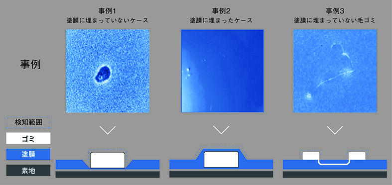 デジタルドットゲージは、スプレー塗装の際に塗膜面に付着した、空気中に浮遊する塵埃や糸くずなどの「塗装ゴミブツ」(図1)に対し出荷前検査にてAI・デジタル技術で人の判断をサポートする装置。用途をゴミブツに絞った理由を松本氏は「塗装現場で起こる不良の中でもゴミブツは形状や種類の多様さ、出荷OK/NG判定の難しさがあり、ムラカワでも一番苦労している。市場ニーズは必ずあるはず」と説明する。