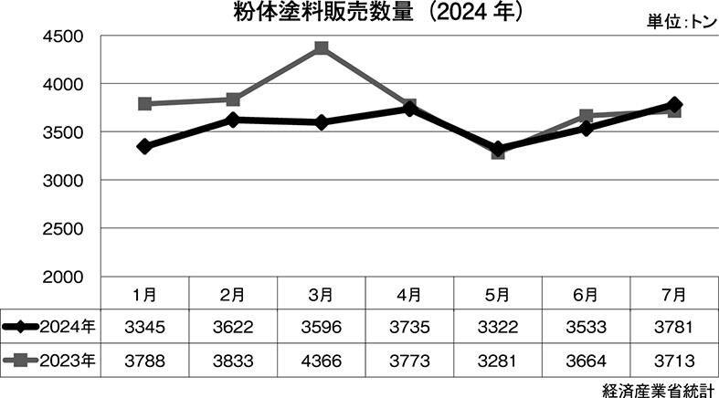 粉体塗料需要が低調に推移している。経済産業統計によると、2024年の販売数量は前年比で減少傾向が続いている。1~7月の期間では前年比5.6%減と停滞基調が続く。需要分野ごとの動きとしては、産業機械向け、例えば工作機械、建設機械、農機具といった分野において、生産数量の減少に連動して粉体塗料需要も減っている。一方で、自動車部品や鋼製家具向けなど、塗料メーカーの販売数量が伸びている分野も一部では見られている。
