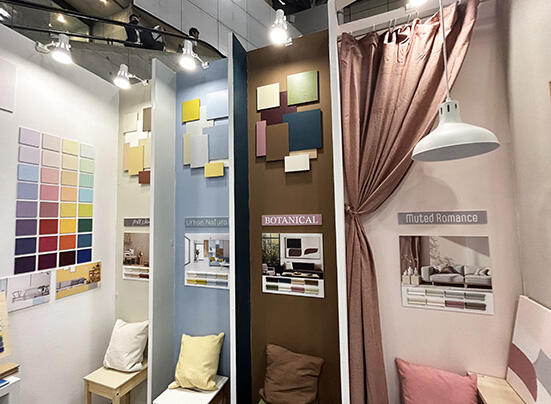 一方、水性多用途塗料「フリーコート」においては、艶感を抑えた144色のカラーパレットを紹介。自然環境色を中心に配色のしやすさをコンセプトに据えた。ブース内では、パレットで選色した多彩なインテリアシーンを伝えた。