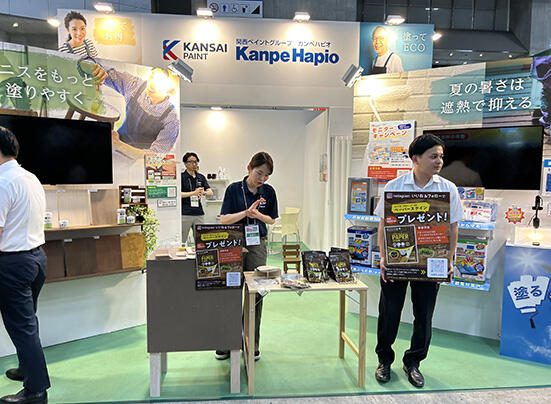 この他、暑さ対策商品として「水性シリコン遮熱建物用」及び「水性シリコン遮熱屋根用」を出展。住宅以外の倉庫や物置の暑さ対策に寄与する点をアピールした。