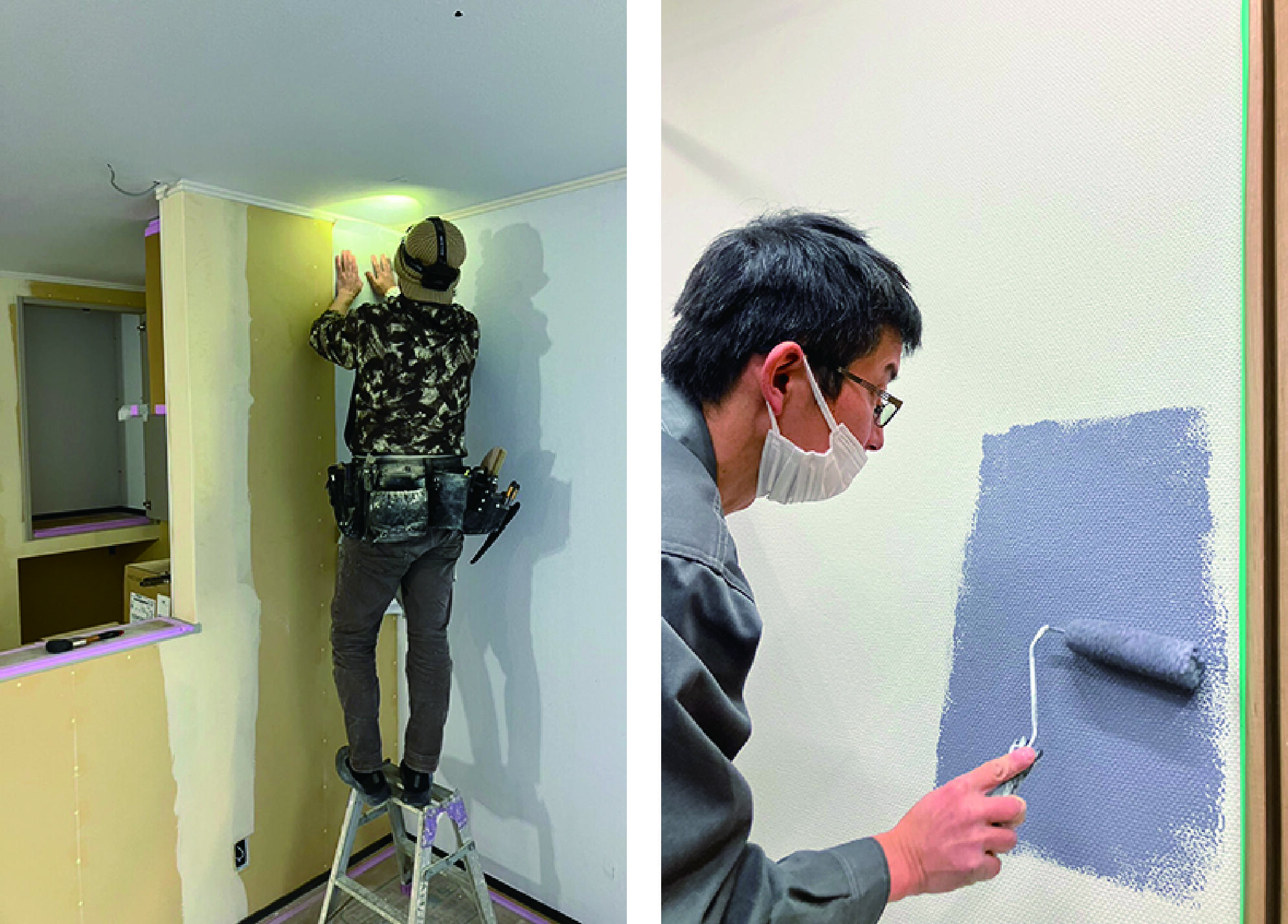 同社の施工で興味深いのが、壁紙(ルナファーザー)を張る職人が塗装まで行うという多能工の活躍だ。「ルナファーザー・テクノが設立した当初から働いてくれている職人さんたちで、いずれも20~30年のキャリアを持つベテラン。張りと塗りの両方の作業を当たり前のようにこなしてくれており、希少な戦力」と北川氏。