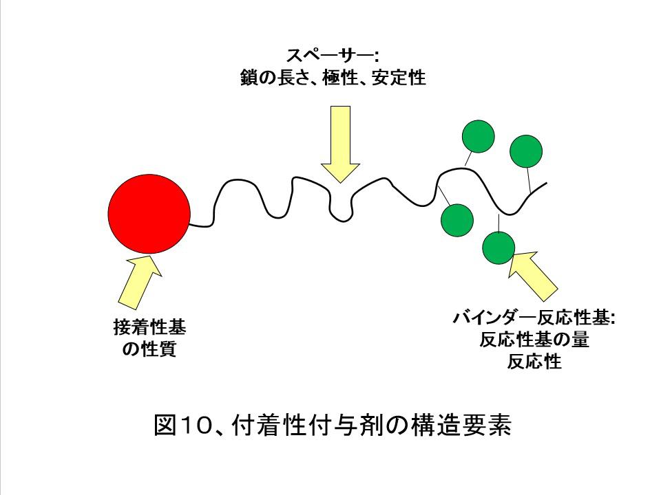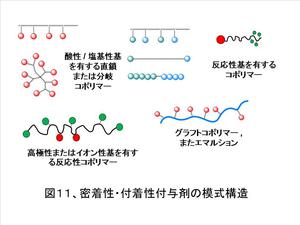 上記の構造要素(接着性基、相溶性鎖、場合により反応性基)を持ちながら、分子形状は様々なものが可能である。図11に付着性付与剤の構造例を示す。