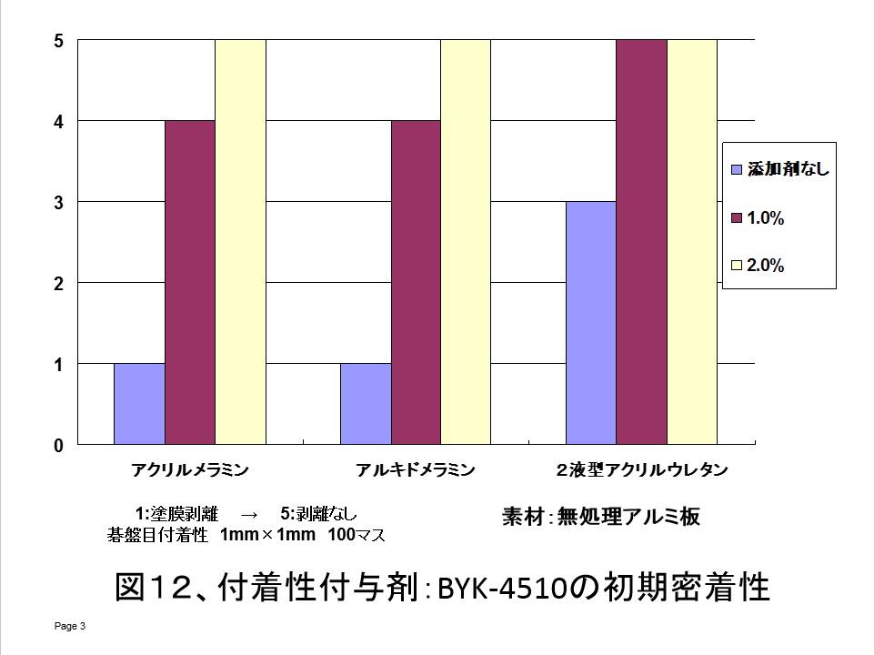 それでは順に特性・試験結果を紹介していこう。まず溶剤系用BYK-4510の各種樹脂系での初期碁盤目付着結果を図12に示す。無処理のアルミ板へのアクリルメラミン、アルキドメラミン、2液アクリルウレタン系塗料で試験をしているが、どの系をとっても初期付着性の向上が確認できる。